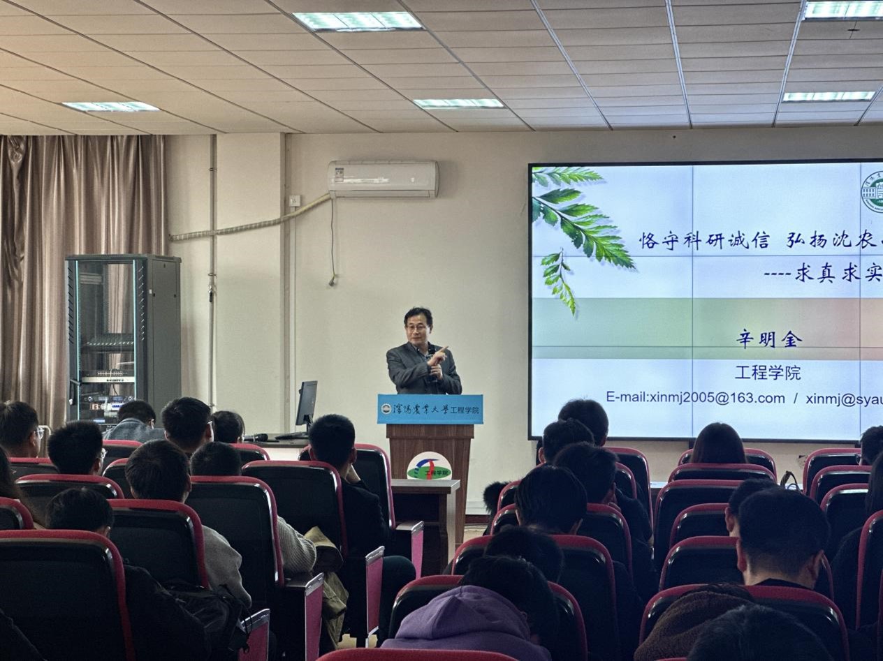 12月8日下午,江南官方网站在501会议室举办“研究生科研诚信与学术道德”主题讲座。本次讲座由学院博士生导师、农业机械化工程学科带头人辛明金教授主讲。研究生辅导员董瀚辰、王立彬老师,江南官方网站全体一年级研究生同学参加了本次讲座。